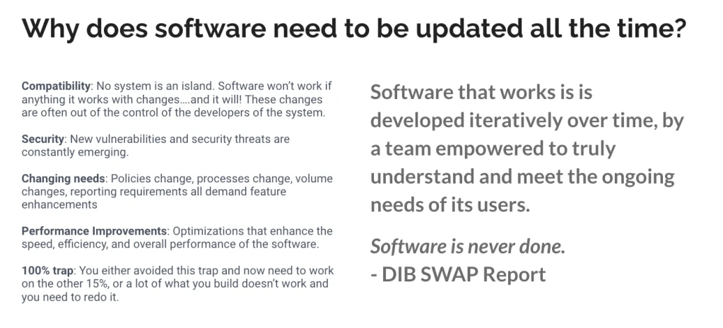 My thought process changed from thinking about sequential and up-front planning to doing tasks simultaneously and adaptive planning that enabled me and my teams to change course, if required. When working on tech products with other teams, however, I realised that the same, outdated waterfall method was still used in other spaces. Software was “procured” and bought from vendors based on an initial needs list without thinking about adaptive needs or being “locked” to a particular software vendor.